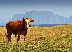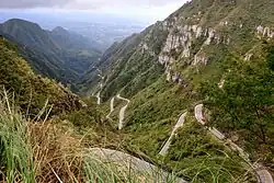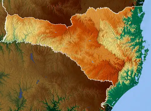 The Basaltic plateau encompasses a significant portion of the state's territory. Comprising basaltic sediments (lava flows), interspersed with sandstone deposits, its eastern boundary is a mountainous edge known as the Serra Geral. In the north of the state, the edge of the basaltic plateau is situated inland. Moving southwards, it progressively approaches the coast until, at the border with Rio Grande do Sul, it starts to descend directly towards the sea. The plateau area is reasonably average and slopes gently westward. The rivers, flowing towards the neighbouring state of Paraná, have carved deep valleys into it.[9] The lands of the mixed ombrophilous forest are infertile, as are the soils of the grasslands, which are utilised for dairy and beef cattle farming. The soils of the humid subtropical forest are characterised by their fertility.[42]