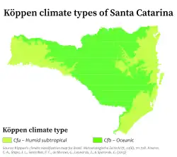 It is one of the Brazilian states with the most mountainous terrain, where 52% of the territory is located above 600 metres.[9] According to the Köppen-Geiger climate classification system, Santa Catarina predominantly features a humid subtropical climate (Cfa) in the coastal lowlands and the lower altitude areas of the plateau, whilst the remainder of the plateau is characterised by an oceanic climate (Cfb).[10]