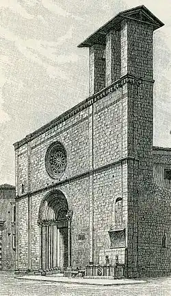 The church is one of the oldest in the city, with its foundation dating back to 1254, during the first foundation of L'Aquila, when the building was established as the church of one of the castles founding the new city, that of Bazzano. In this sense, the church is considered even older than the cathedral[2] and was built on the site of a previous church probably dedicated to Saint George and constructed in the 1230s by the castle dwellers of Goriano Valli,[3] from which the name of the historic district where it is located derives, and later restored by residents from Bazzano.[2] This is evidenced by the wall parallel to "via del Grifo", certainly existing before the rest of the building.[2] What is certain is that in 1272 the church was elevated to head of a quart in the framework of the new division promoted by the then Captain of the City Lucchesino da Firenze, positioning itself from then on as one of the main reference poles of the city.