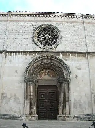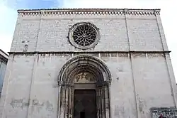 The facade, erected after the earthquake of 1349, features typical architectural and decorative elements of Aquilan religious architecture that are often repeated: below the typical horizontal straight-line termination, adorned with a sequence of Romanesque-Gothic archess, the front is clad in white stone divided into regularly squared and aligned blocks. It is flanked by pilasters on the sides, horizontally divided by a string course, and vertically tripartite by other pilasters that extend beyond the string course, dividing the facade into six panels that also include the portal and the rose window, making it unique in the Aquilan context but also one of the highest achievements before the facade of Collemaggio.[11] The rose window, among the largest and most beautiful in L'Aquila, features refined openwork tracery including twelve human figures in the form of telamons, each with a specific mythological significance.[12] This uniqueness, also isolated within the city context, was already present in some Umbrian thirteenth-century and late-thirteenth-century Apulian roses.[11] A second rose window is visible in the side wall.