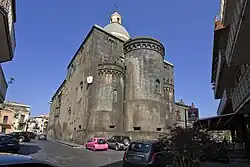 A church at the site was initially built in the 13th century, according to an inscription found below the sacristy dated 1239. Different portions of the church are built in different styles. The oldest configuration is the Romanesque semicircular apses with a merlionated cornice along the roofline and gothic elements. Some of the tall narrow windows in the apse have been walled up. The church has a wide central nave and two aisles and a cruciform transept near the apse. Much of the construction used the black lava stones. The interior nave has a simple Renaissance style, recalling Brunelleschi churches in Florence, likely imposed by the Tuscan architect Andrea Calamech (1524-1589). The aisles have few windows on high, but they have elaborate sculpted romanesque and rounded portals with braided 3/4 columns. The nave ceiling was frescoed with scenes from the life of the Virgin by Filippo Tancredi.