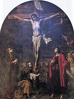 Among the altarpieces are six works by Giuseppe Velasques: a Martyrdom of St James, an Annunciation, an Assumption of the Virgin, Coronation of Mary, and Martyrdom of St Andrew. His Holy Family remained incomplete. The lunette frescoed with the Virgin saving the city of Randazzo from the Lava flow was painted by Alibrandi. Other paintings include an Assumption of the Virgin was painted by Giovanni Caniglia; a Martyrdom of St Agatha and St Lawrence by Onofrio Gabrielli; and a Martyrdom of St Sebastian by Daniele Monteleone; and a Baptism of Jesus by Francesco Paolo Finocchiaro.[3]