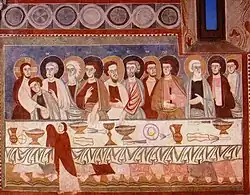 The fresco cycle belongs to the tradition of 13th-century pictorial cycles in Abruzzo, which also includes those of the Abbey Church of San Tommaso Becket in Caramanico Terme and the Church of Santa Maria di Ronzano in Castel Castagna. The cycle is dated to the last years of the 13th century, between 1264 and 1283, the year the Madonna del Latte altarpiece was created, which is preserved in the National Museum in L'Aquila. This work, attributed to Gentile da Rocca, includes these frescoes. The names of the work's patrons can be found at the bottom of the apse: Guglielmo Morelli of Sant'Eusanio (whose existence is documented in 1259), his wife, an abbot named Guido, and three young women.[8]