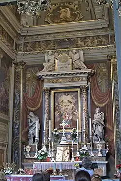 The altarpiece is flanked by two statues in Carrara marble, representing Mary Magdalene and St. John the Apostle, signed by Andrea Fantoni in 1716 and coming from the suppressed church of Santa Caterina.[28]