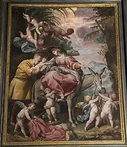 The scene of the Flight into Egypt is on the right wall: it shows a pause in the journey of the Holy Family, with the Madonna in traveling clothes riding a donkey and in the act of handing the Child to Joseph. The family is surrounded by a group of eight little angels: three are holding the reins, one is spreading a cloak on the ground, one is reaching out to help the Virgin descend from the donkey, and three are flying in the air. The whole scene is set in an idyllic landscape. This painting is also signed by Barbelli.[22][21]