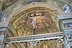 This is located on the barrel vault and is a highly illusionistic scene: above the real entablature, Barbelli painted a balcony in perfect perspective with angels and cherubs sitting on the balustrade. On the corner pedestals, Barbelli painted the four Evangelists.[24]