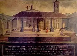 The origins of the cult are not based on a Marian apparition but on devotion to a votive image.[2] Near the present church, inside the Torrione del Miliato (from the convent of the Humiliati), an image depicting a Madonna and Child had been painted by a certain Giovanni da Caravaggio during the 15th century. The image was later protected by a canopy with an altar and, later, a portico with a gate.[3][4] Only later, in 1537, were miracles reported: in the same year the school of the Santissimo Sacramento of the church of the Santissima Trinità placed itself under the protection of the fresco, taking care of the place.[4][5] The acts of the Castelli visit of 1579 call it Santa Maria del Toresino,[5] those of the visitor Regazzoni of 1583 Santa Mariae de Turione in Civitatis.[5]