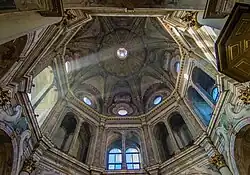 The church is divided into a cubic volume set on a square plan, on which rest an octagonal dome and four small bell towers at the corners. Inside, the central plan space is generated by the eight sides of the dome projected within the square perimeter of the church; the figure thus inscribed creates a succession of niches for each of the faces of the octagon. The façade is unfinished and is plastered in the lower part.[4] In the southern part there is a very particular decoration of circular shapes tangent to each other, enclosed by a terracotta frame. The internal decoration was made at the beginning of the seventeenth century by important painters of the Baroque school. The central hall has a square shape, on which an octagonal division is inserted in the upper part that follows that of the dome.[5] The presbytery was built starting in 1564. In the sails in which the second dome that covers the main altar is set, eight sibyls arranged in pairs, painted by Guglielmo Caccia, are represented.