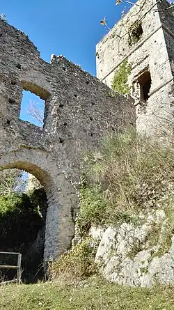 The name "in gruptis" refers to the karst caves in the area, which were used to gather and distribute water to the abbey.[1][2] The oldest recorded name was Santa Maria di Monte Drago, in reference to the mountain where the abbey is located.[1][3] The two names were used in the 12th century with inconsistent spellings, such as "Santa Maria di Monte Drocho", "Santa Maria in Cripta", "Santa Maria de la Grocta".[4] In a 1545 decree by the then abbot Blasio Sellaroli the abbey was named Santa Maria dello Vallo di Vitulano ("Saint Mary of the Valley of Vitulano").[5]