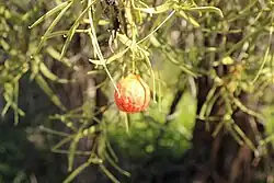 It bears a bitter fruit, from which a common name derives, in contrast to congener Santalum acuminatum - sweet quandong. The plant is also known as Ming.[2] It occurs in a hemi-parasitic relationship with the roots of several other plants, in a non-destructive way, as with all the species of the genus Santalum.