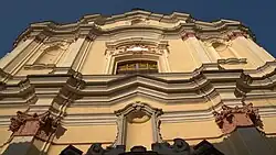 A high plinth supports the second order, again with pilasters in line with those of the lower order. The main facade has two niches with a coping and an angel's face in the side panels. In the center is a window with a mixtilinear cymatium containing the date of the end of construction, MDCCXL (1740). On the side facade, however, there are three very dynamic windows that contribute to the interior lighting, with arched architraves, festoons and cherubs' heads.[25]
