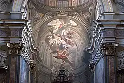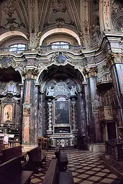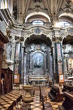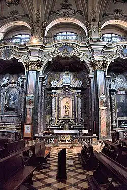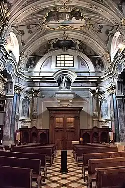 During the course of the 18th century, the interior decorations were entrusted to the Galliari brothers, followed by the frescoes and the completion of the altars.[17] The pipe organ was installed in 1783 by the Serassi family (who also restored the instrument in 1835 and 1840).[16] The current organ, however, was built by the Benzi e Franceschini company in 1909 and restored by the Inzoli company in 2006.[18]