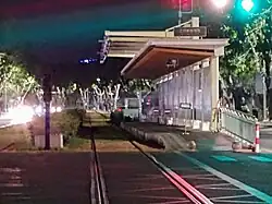 The tram operates without overhead wires. Instead, the trams are charged by contacts above each stop.[3]