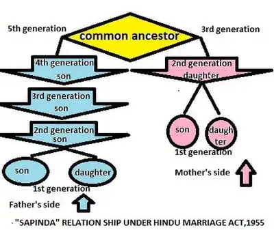 For example, if the bride is the offspring of any person within five generations (inclusive) on the Bridegroom's father's side and three generations (inclusive) on the groom's mother's side, or vice versa, they will be referred to as "Sapindas" of each other. In these cases, the Hindu Marriage Act of 1955 bars marriage between two Hindus of this genealogy.