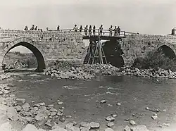 During the Sinai and Palestine Campaign of World War I, Australian sappers repaired a bridge at the historic crossing of the Jordan River at Jisr Benat Yakub (also known as Jacob's Ford). Here the retreating Ottoman and German rearguard had blown up the bridge's central arch, which was repaired in five hours by sappers attached to the Australian Mounted Division. While the light horse brigades forded the river, continuing the Desert Mounted Corps' advance to Damascus, the sappers worked through the night of 27/28 September 1918, to repair the bridge to enable the division's wheeled vehicles and guns to follow on 28 September.[9][10][11]