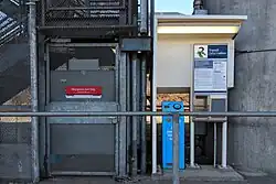A second, unofficial entrance is at the south end of the station and is not wheelchair accessible. This entrance is technically an emergency exit that leads down from platform 1,[7] but people commonly use it as a safe way to access the station from Spruce Street, which is next to the station but not accessible using the main entrance. TransLink nevertheless installed Compass card readers at the site.[8]