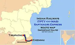 The 16057 / 16058 The Sapthagiri Express is an Express train, operated between Chennai Central and Tirupati Main. The train was nostalgic among the millennium generation due to the green and yellow livery of the train in its past.[1][2]