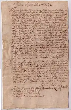 I have been afflected ever sence the beginning of march with a woman that told me her name was willds and that she came from Topsfeild but on the 22 April 1692 Sarah willd did most greviously torment me during the time of hir Examination and then I saw that Sarah willds was that very woman that tould me hir name was willds and also on the day of hir Examination I saw Sarah willds or hir Apperince most greviously tortor and afflect mary walcott, Mircy lewes and Abigail willia [ms] and severall times sence Sarah wilds or hirs Apperance has most greviously tortored and afflected me with variety of torturees as by pricking and pinching me and almost choaking me to death.[2]
