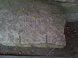 The Salem Witch Trials Memorial includes a bench inscribed with the names of all those executed, including Sarah Wildes. Arthur Miller, who wrote The Crucible, a play based on the trials, spoke at the dedication, as did Nobel Laureate and Holocaust survivor Elie Wiesel.[12] The city of Danvers also created a memorial to the victims. The execution site was finally pinpointed in January 2016, by the University of Virginia's Gallows Hill Project, and the city plans to create a new memorial to the victims there.[13]