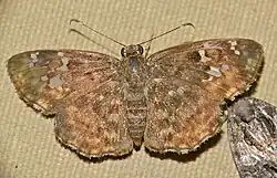 The wingspan is 36–38 mm for males and 38–40 mm for females. Adults are on wing year-round, although they are scarcer in winter and the dry season.[2]