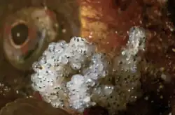 The female spawns roughly 3,000 eggs under a rock,[2] in clam burrows, or in other containers, after which the male plays a crucial role in guarding and fanning the eggs until they hatch.[6][8] The eggs have a diameter of approximately 0.9 to 1.5 millimeters (0.035 to 0.06 inches), and their filaments help them adhere to the nest and to one another. Upon hatching, the larvae measure approximately 3 millimeters (.12 inches) in length. Sarcastic fringeheads spawn between January and August at depths ranging from 45 to 90 feet.[8] The genital papilla, located at the rear of the urogenital opening, differs between sexes: males have a pointed papilla, while females have a rounded one.[7] Sarcastic fringeheads can live up to a maximum of about 6 years, which contributes to their reproductive strategies.[7]