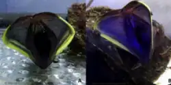 Male sarcastic fringeheads are distinguished by their extremely wide mouth gape, which, when open, may be as much as four times its size when closed. The interior of the mouth is brightly colored,[9] with yellow at the posterior, which is hypothesized to amplify its display.[8][10] Additionally, properties in their buccopalatal membrane give them a green fluorescent appearance.[7]