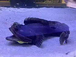 Sarcastic fringeheads can be up to 30 centimetres (12 in) long,[6] elegant and slender,[2] and are mostly scaleless with great pectoral fins and reduced pelvic fins. The swimming movements of these fish mainly consist of short, dart-like movements.[7] Their body coloration varies from warm brown to gray with a blotchy appearance.[8]
