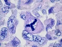 Sarcomatoid carcinoma, sometimes referred to as pleomorphic carcinoma,[1] is a relatively uncommon form of cancer whose malignant cells have histological, cytological, or molecular properties of both epithelial tumors ("carcinoma") and mesenchymal tumors ("sarcoma"). It is believed that sarcomatoid carcinomas develop from more common forms of epithelial tumors.[2]