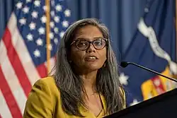Gupta has maintained a public profile with speaking engagements and media appearances over the decades. In 1996, at 21 she was the youngest member on a panel on mobilizing women at the first Feminist Expo in Washington, DC.[1] In 2002, she was a guest speaker at the Young Communist League (YCL) 7th National Convention. In 2016, she testified before the US Senate Committee on Small Business and Entrepreneurship. She spoke in 2018 at the Aspen Institute on "The Justice System and Jobs: How Court Decisions Are Shaping Americans’ Work Lives". She appeared on a number of panels and in events sponsored by the Obama administration. Gupta has appeared in various media, including MSNBC, Al Jazeera America, PBS, CNBC, and Fox News, and written for the Huffington Post and The Hill, and been featured in The Wall Street Journal, Bloomberg, and Politico.[4]