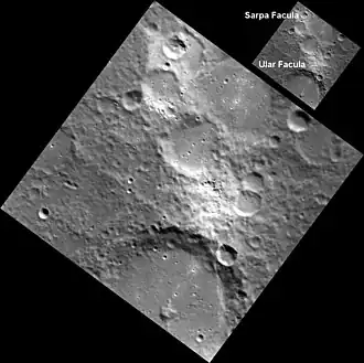 Sarpa Facula is north of Ular Facula. Both faculae are associated with irregular depressions near their centers. The combination of the presence of these pits with the bright halos around them lead to the interpretation of this feature as a site of explosive volcanism.[2] Other faculae to the northeast (Havu Facula and Bitin Facula), and southwest (Pampu Facula) are also associated with irregular depressions and are likely volcanic.
