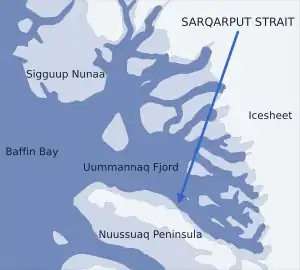 Sarqarput Strait is a strait in the Uummannaq Fjord system in northwestern Greenland. It separates Uummannaq Island in the northeast from Nuussuaq Peninsula in the southwest.[1] The strait waterway is part of the southern arm of Uummannaq Fjord, narrowing into Ikerasak Fjord in the southeast, at the base of Nuussuaq Peninsula. The Sarfaagfip Kussinnersua and Kuuk rivers flowing from the peninsular glaciers empty into the strait.[1]