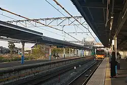 This station consists of two opposed side platforms serving two tracks, connected to the station building by a footbridge.