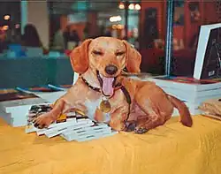 Serge Scotto introduced his dog to many celebrities, taking him to trade shows and literary gatherings. Saucisse appeared on many television shows including Vie privée, vie publique, hosted by Mireille Dumas, La Méthode Cauet or On ne peut pas plaire à tout le monde by Marc-Olivier Fogiel.[9] Saucisse was photographed with many people such as Ève Ruggieri, Bernard Werber, Florence Foresti and Raymond Devos.[9] During these few years, Saucisse continued to follow Scotto and was "used" several times by the latter as a media figure to expose certain injustices such as the kidnapping of Florence Aubenas and Hussein Hanoun.[9] The dog also helped his master during all these years in his columns for the daily Métro.[10]