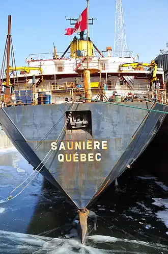 Sauniere underwent a major refit in late 1998, early 1999, followed by an even larger one in late 2001 and early 2002. On 21 September 2006, the ship lost its starboard anchor near Grande Entrée, Magdalen Islands. On 18 September 2007, the ship collided with the south sea wall of the Canso Causeway. The vessel suffered a dent above the waterline outside the #1 portside tank. A crack was discovered in the forepeak in January 2009 that necessitated immediate repairs. On 1 March 2009, the ship was laid up at Montreal, Quebec.[2] Sauniere was sold to Avsar GS in 2011, towed to Aliağa, Turkey and broken up with demolition listed as complete on 2 July 2011.[1][5]