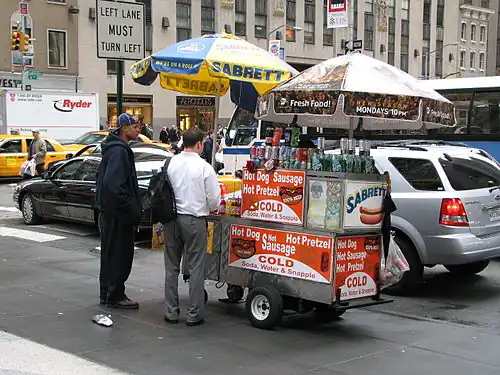 In the United States, sausage sandwiches are widely popular. One variety, colloquially known as a hot dog, is particularly popular, especially at sporting events, carnivals, beaches, and fairs.[6][7] They are also sold in many delis as well as food stands on street corners of large cities. Many American hot dog vendors also serve Polish, Italian, Mexican, and German (e.g. bratwurst) sausage sandwiches in addition to their regular fare.