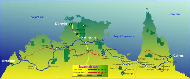 The Savannah Way is a route of highways and major roads across the tropical savannahs of northern Australia, linking Cairns in Queensland with Broome in Western Australia. Promoted as a self-drive tourist route, it joins Cairns, Normanton, Borroloola, Katherine, Kununurra, Fitzroy Crossing, Derby and Broome.[1] It has been designated by the Queensland Government as a State Strategic Touring Route.[2]