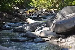 Saw Kill tributary is located in Ulster County. 19.7 miles (31.7 km) long, it rises in Forest Preserve lands on the lower slopes of Indian Head Mountain and, after flowing through the town of Woodstock, empties into the Esopus just above Saugerties; just north of Route 209 and just downstream of Ulster Town Hall. The Saw Kill is one of the major tributaries to the Esopus. There is a sedimentary delta halfway across the Esopus Creek channel in this area, which indicates high sediment loads in the Saw Kill.[5]