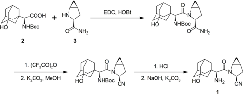 The synthesis of saxagliptin by Bristol-Myers Squibb by the amide coupling of N-Boc-3-hydroxyadamantylglycine (2) and methanoprolineamide (3) with EDC. The former is commercially available, whereas the latter is available as the N-Boc analog. The prolineamide moiety is subsequently dehydrated with trifluoroacetic anhydride to give the cyanide as the trifluoracetate ester, which is hydrolyzed. Removal of the Boc protecting group, followed by neutralization gives the desired product (1):[16]