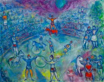 The canvas features acrobats, trapeze artists and clowns. The subject of circus was dear to the artist.[1] Chagall often returned to the circus as a subject matter in his artworks.[2] He considered clowns, acrobats and actors as tragically human beings who are like characters in certain religious paintings.[3] Among other Post-Impressionist and Modern painters who featured the circus in their works are Georges Seurat, Henri de Toulouse-Lautrec, Pablo Picasso, Georges Rouault, Kees van Dongen, and Fernand Léger.[3]