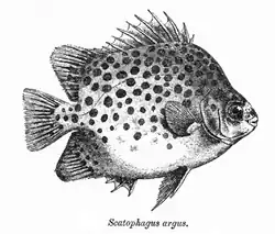 Scatophagus was first formally described as a genus in 1831 by the French zoologist Georges Cuvier with Chaetodon argus which had been described from India by Linnaeus in 1766 later designated as the type species.[1] The genus name is a compound of skatos meaning "dung" and phaga which means to eat, a reference to this species purported taste for human faeces.[2]