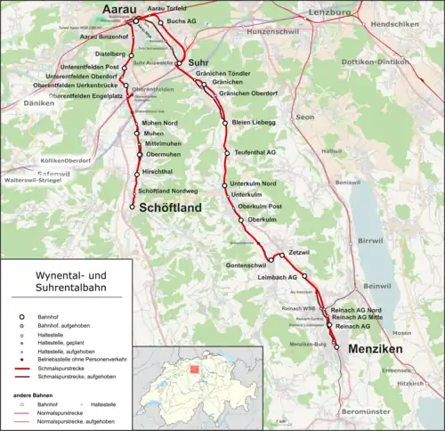 The Schöftland–Aarau–Menziken railway line is a metre gauge railway line in the canton of Aargau in Switzerland. It provides a through service, in the form of an inverted 'V', from Schöftland to Menziken via Aarau. The two parts of the V were built separately, with the Aarau–Menziken railway line running through the Wynental, and the Aarau–Schöftland railway line running through the Suhrental.