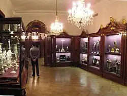 Schatzkammer, a German word which means "treasury" or "treasure chamber", is a term sometimes used in English for the collection of treasures, especially objets d’art in precious metals and jewels, of a ruler or other collector which are kept in a secure room and often found in the basement of a palace or castle.[1] It also often included the wider types of object typical of the Renaissance cabinet of curiosities. A very small but evocative Renaissance room in a tower at Lacock Abbey was designed for keeping and viewing the treasures of the newly rich owner.