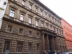 Prior to the construction of the current Palace, the building lot was occupied by an orphanage. It was sold to two railway magnates, Jan Schebek and František Ringhoffer, in 1868.[3][4] Jan Schebek then commissioned architect Vojtěch Ignác Ullmann to design the current building. Ullmann's designs were inspired by renaissance Rome, and the building was constructed between 1870 and 1872. Originally designed to be three stories tall, additional floors have been added since the original construction. The building has four wings, with a rectangular courtyard in its center. Of special note are its ceiling murals by Viktor Barvitius, sculptures by Josef Wagner, and the building's marble staircase which leads to the first floor's main reception rooms.[5]