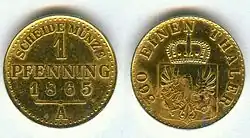 Scheidemünzen (singular – Scheidemünze) were representative coins or token coins issued alongside Kurantgeld or currency money in Austria and Germany up to start of the First World War in August 1914 whose intrinsic metal value was less than the legal value stamped on them. Like Notgeld ("emergency money") they were a kind of credit money or fiat coin. The term Scheidemünze ("division money") referred to the "division into hellers and pfennigs during the purchase process" ("Scheiden auf Heller und Pfennig beim Kaufvorgang"). It thus applied to the low- to medium-value coins and is often translated as small change coin, small-coin change or just small coin. Since 1915, all coins minted in Germany, including the current euro coins have been Scheidemünzen or fiat money as opposed to currency or commodity money whose nominal value is fully covered by its intrinsic value.