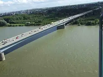 The Schierstein Bridge (German: Schiersteiner Brücke) is 1,282-meter (4,206 ft) long, four-lane highway bridge in Germany. It carries Bundesautobahn 643 over the Rhine River between Mainz-Mombach, Rhineland-Palatinate and Wiesbaden-Schierstein, Hesse (Rhine kilometrage 504.45). Crossing two arms of the Rhine and the intervening island of Rettbergsaue, the bridge is made of six individual structures, including 100 m (330 ft) from prestressed concrete. It was built between 1959 and 1962.