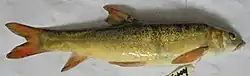 Schizothorax is a genus of cyprinid fish found in southern and western China, through northern South Asia (Himalaya) and Central Asia, to Iran, with a single species, S. prophylax, in Turkey.[1][2][3] They are primarily found in highland rivers, streams and lakes, although a few species occur in lower-lying locations, like Lake Balkhash and lakes of the Sistan Basin.[1][2][4][5] Their scientific name means "cloven-breast", from Ancient Greek schízeïn (σχίζειν) 'to cleave' and thórax (θώραξ) 'breast-plate' (see also thorax). The western species are typically referred to as marinkas from their Russian name marinka (маринка), while the eastern species are usually called snowtrout. Although they do resemble trouts in habitus this is merely due to convergent evolution and they are by no means closely related apart from both being Teleostei: Cyprinids are in the teleost superorder Ostariophysi, while trouts are in the superorder Protacanthopterygii. Their ancestors must thus have diverged as early as the Triassic, more than 200 million years ago.