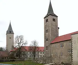 On the left is the lower castle with the Bergfried tower, on the right is the upper castle with the Hausmannsturm tower.