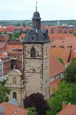 The three-aisled basilica is Romanesque in origin and partly Gothic in style. The Benedictine monastery was founded in 1136[2] by the brother of the Naumburg bishop Hildeward, Walther von Glisberg, whose gravestone is on display in the church. It shows the imperial ministerial, who was propertied at the Kunitzburg in Jena, and his wife in the style of Romanesque depictions of persons. He was also Vogt of his foundation.[2] The monastery was a branch monastery of the Abbey of St James in Regensburg, founded by Marianus Scottus, from which the present name Schottenkirche is derived (Schotten is German for "Scots"). By 1200, the building work was completed and the monastery church finished. In the early 13th century, the western nave bay was replaced by Early Gothic arcades.[3] First in 1299, then again in 1472, the great Erfurt city fire destroyed parts of the church, which were subsequently rebuilt in Gothic forms, reusing some of the old stones which are still distinguishable today.[3] Various architectural and decorative elements refer to the Iro-Scottish origin. The choir shows Gothic forms from the time after the second church fire in 1472.