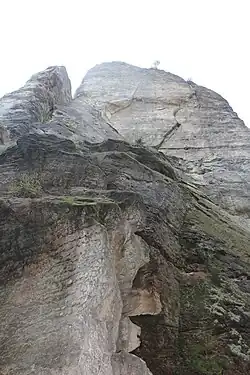 The Schwedenturm ("Sweden Tower") in East Germany is a 35-metre-high rock formation made of sandstone in the hills of Saxon Switzerland near the spa town of Rathen and the famous Bastei rocks.