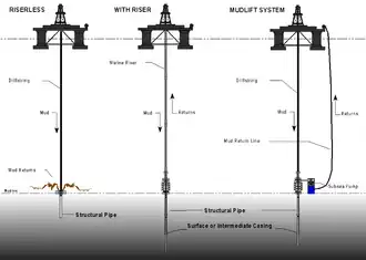 The drillship that has been used for the past 20 and more years, the JOIDES Resolution, drills without a riser.[2] Riser-less drilling uses seawater as its primary drilling fluid, which is pumped down through the drill pipe. This cleans and cools the drill bit and lifts cuttings out of the hole, piling them in a cone around the hole.[3] Japan's new drillship, the Chikyu, uses a riser for drilling. The riser system includes an outer casing that surrounds the drill pipe, to provide return-circulation of drilling fluid for maintaining pressure balance within the borehole. A blowout preventer (BOP) protects the vessel and the environment from any unexpected release of gas and oil. This technology is necessary for drilling several thousand meters into the Earth.[3]